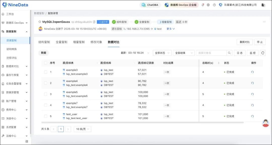 NineData 复制链路中集成了数据对比能力,用来确认源端与目标端的数据是否一致,帮助团队:
