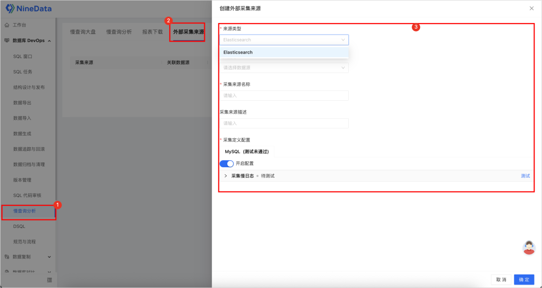 慢查询分析模块新增支持从外部来源采集慢日志,本次适配 Elasticsearch 作为外部数据源。