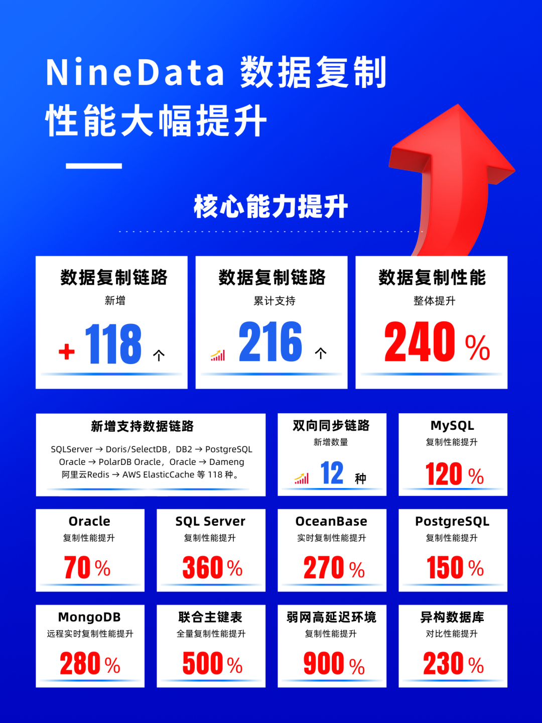 NineData 数据复制功能方面实现了质的飞跃,不仅新增了大量数据源支持,在性能优化和功能增强方面也取得了重要进展。2025 年,NineData 数据复制链路累计新增 118 条,数据复制性能整理提升 240%。