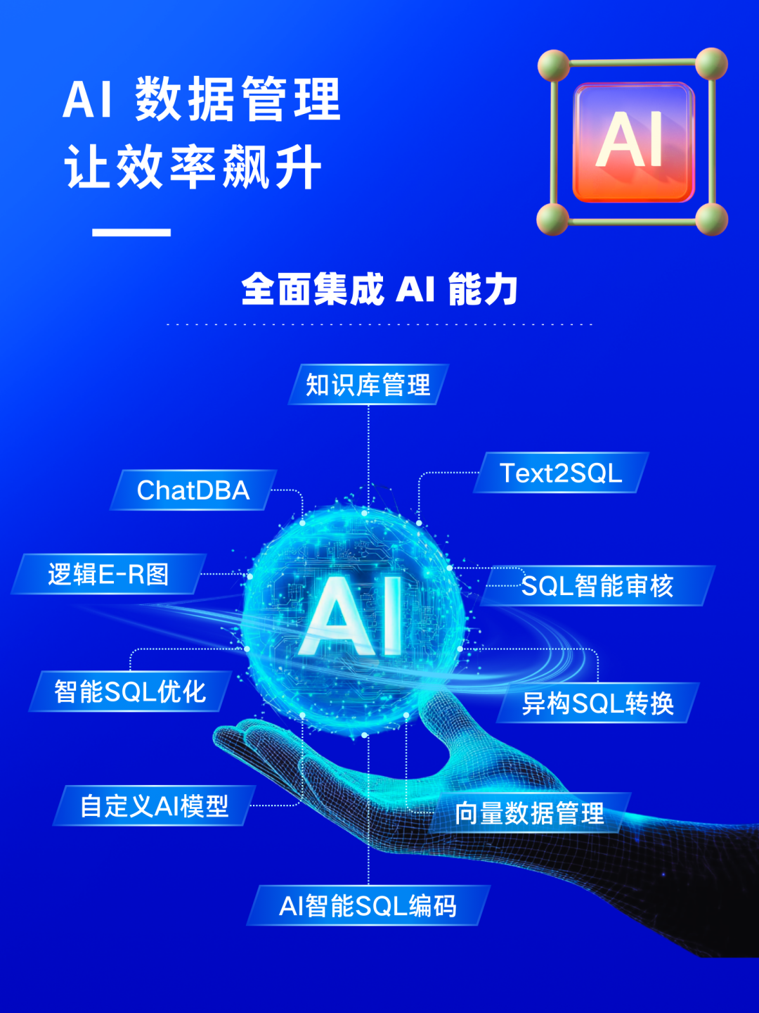 在 AI 智能化方面,NineData 进一步深入开发 AI 数据管理能力。通过大模型与数据库专家经验融合,数据库开发管理效率提升数倍。