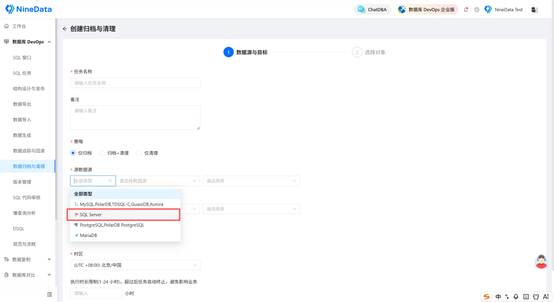 SQL Server 也可以将历史数据治理纳入 NineData 的统一任务体系中,按需配置 归档、归档+清理、仅清理 等策略,兼顾存储优化、性能维护与运维流程一致性。