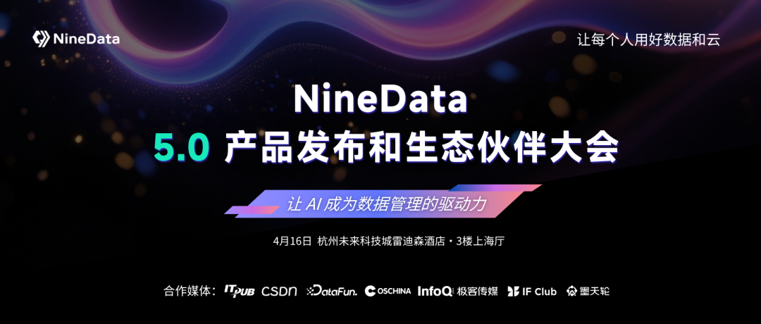 4 月 16 日,NineData 5.0 产品发布会和生态伙伴大会在杭州成功举办。NineData 5.0 围绕数据复制 A2A 架构、 AI 原生数据库 DevOps 、ChatDBA 智能运维三大核心升级。本次发布会同时展示了与生态伙伴的深度合作,共同推进多行业场景解决方案,通过技术创新与生态协同,为企业提供更智能、更统一的数据管理服务。