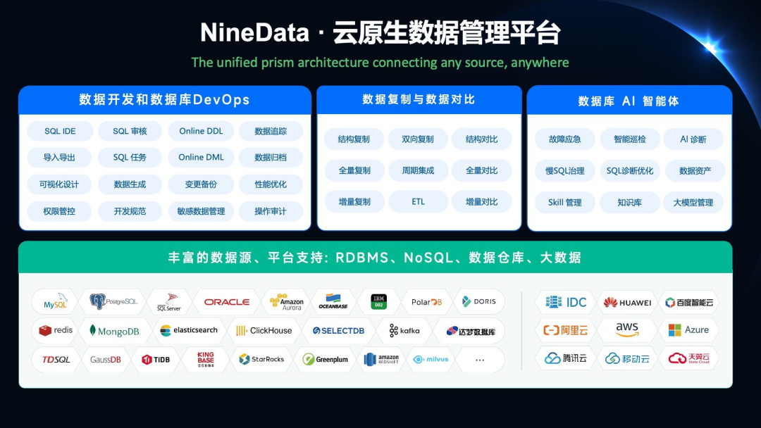 NineData 是玖章算术(浙江)科技有限公司旗下的智能数据管理平台,专注于云计算与数据管理基础技术创新,依托云原生架构与 AI 能力,打造覆盖数据库 DevOps、数据复制、数据对比、智能运维等核心场景的一体化数据管理平台,帮助企业在多云、混合云及复杂异构环境下实现更高效、更安全、更智能的数据管理。