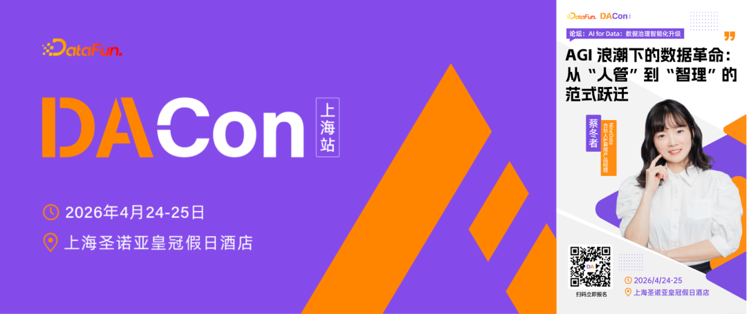 4 月 24 日至 25 日,由 DataFun 主办的 DACon 2026 上海站将在上海圣诺亚皇冠假日酒店举行。NineData 合伙人兼首席产品经理蔡冬者将带来主题演讲《AGI 浪潮下的数据革命:从“人管”到“智理”的范式跃迁》。