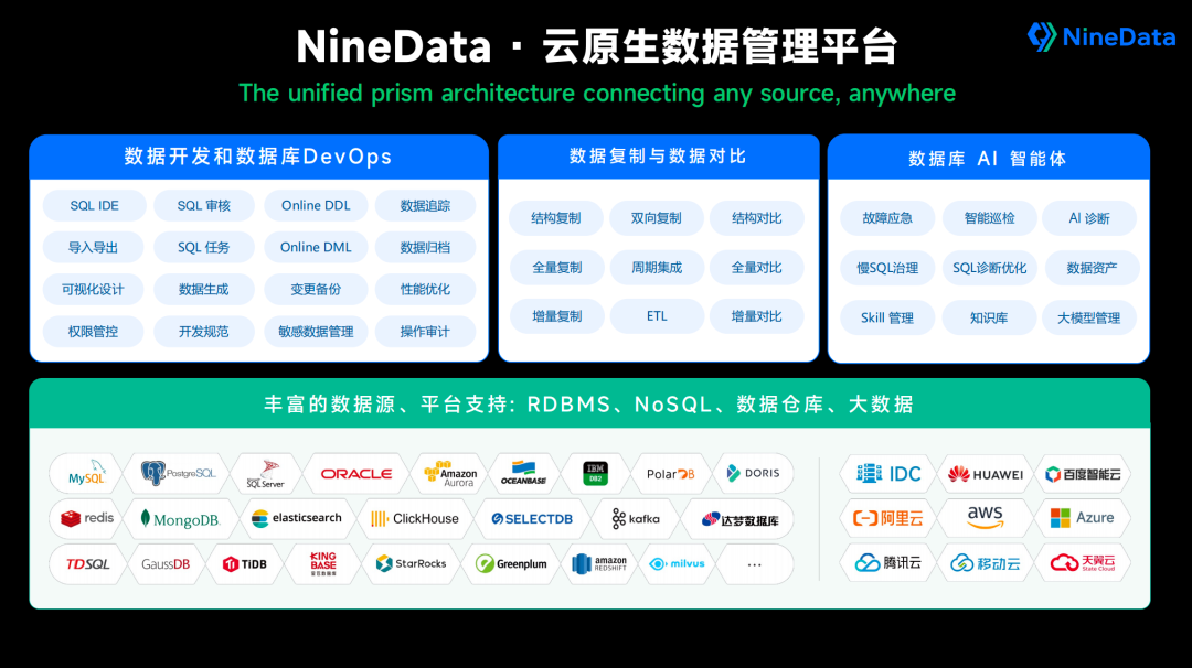 NineData 是玖章算术(浙江)科技有限公司旗下智能数据管理平台,专注于云计算与数据管理基础技术创新,依托云原生架构与 AI 能力,打造覆盖数据库 DevOps、数据复制、数据对比、智能运维等核心场景的一体化数据管理平台,帮助企业在多云、混合云及复杂异构环境下实现更高效、更安全、更智能的数据管理。