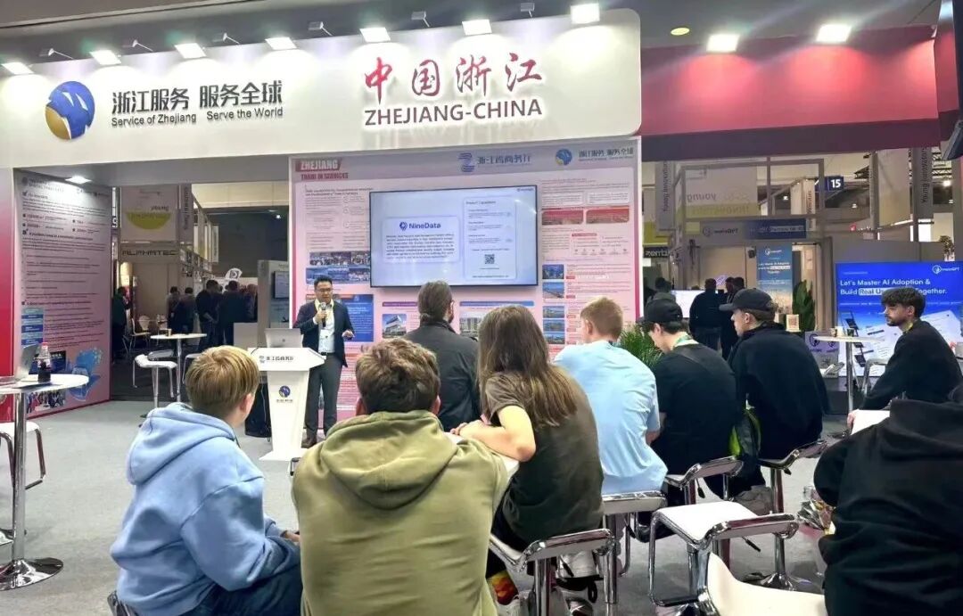 2026 年 4 月 24 日,2026 德国汉诺威工业博览会在汉诺威会展中心顺利闭幕。在浙江省商务厅组织下,玖章算术 NineData 作为浙江参展企业代表亮相“2026 浙江服务贸易(汉诺威)数字生态展”。NineData 面向全球客户、合作伙伴及行业观众展示企业级智能数据管理平台的核心能力,充分展现了中国数据技术企业在国际上的创新实力。