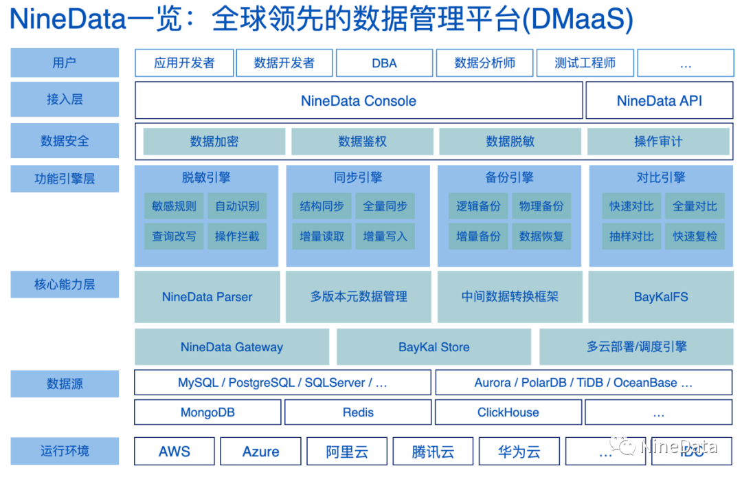 最下层是我们支持的基础设施范围,主要包括云厂商和自建机房,也就是说,无论是云上还是云下的数据库,也不论是云上云厂商专属数据库还是自建数据库,NineData都会提供支持。当然NineData本身也是一个SaaS服务,同时部署在各朵云上。