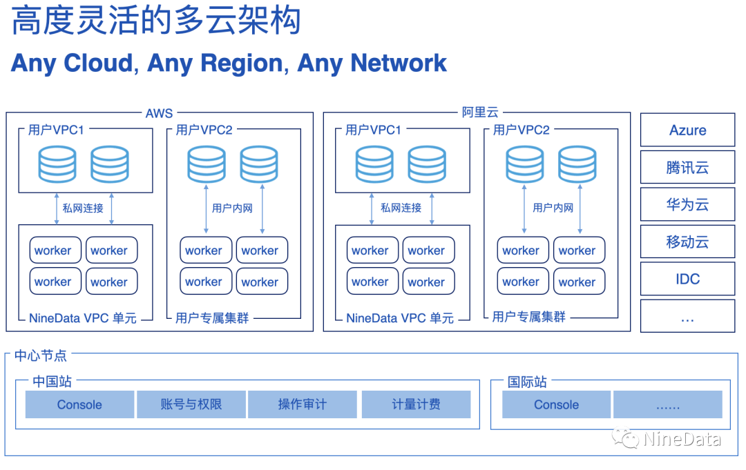 首先来看NineData的多云架构,对于对于NineData这样的数据管理服务来说,多云的问题主要难点有两个,第一个是部署的问题,因为NineData的服务节点最好是越靠近用户的数据库节点越好,举个例子,如果要服务阿里云北京Region的用户,那么NineData最好也部署在阿里云的北京Region,一方面可以获得更好的网络连接,另一方面也可以避免出现网络流量方面的开支。以此类推,要服务所有的云厂商,就得在每个云厂端的Region里部署NineData的服务。但是今天全球主流云厂商的所有Region加起来起码有几百个,如果再算上可用区就更多了,如果在每个云的每个Region上都预先部署然后才能提供服务的话,这将是一个巨大的工作量并且会造成巨大的成本。所以我们将NineData的架构拆分为了中心控制节点与单元节点,如下图所示: