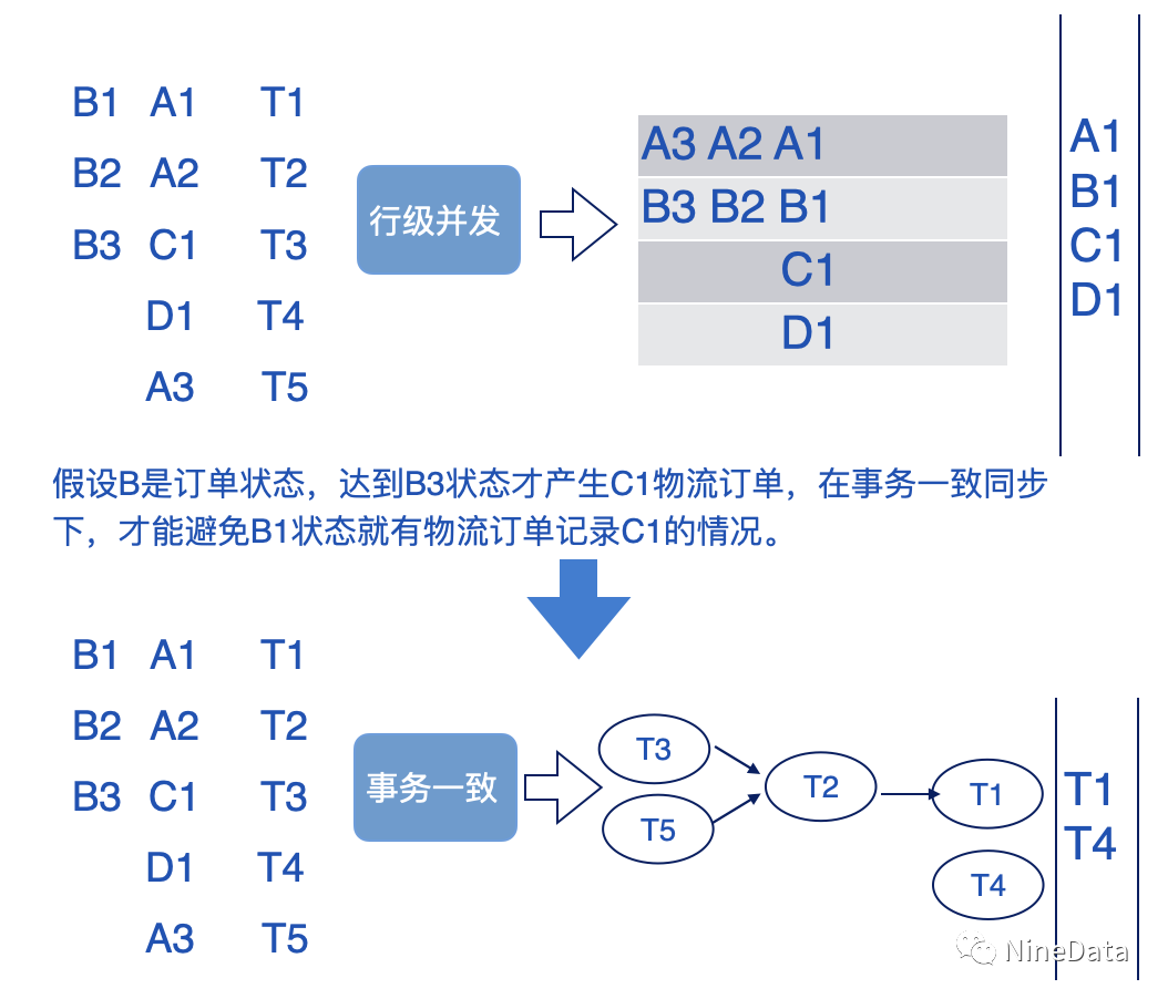 第三是做了事务级并发。传统的行级同步,虽然能够保障最终一致,但对于在线业务来说,这种同步方式可能会带来业务故障。比如下图中,创建交易订单后,订单状态达到B3才能创建物流订单,但行级并发会把交易订单和物流订单同时并发投递到目标,因此目标库在B1状态下就可能收到了物流订单,如果目标库提供了业务的读流量,并且根据物流订单来推进订单状态,就会产生业务逻辑错误。因此为了更好地支持在线数据库的一致性同步,我们提供了事务级并发,像数据库的内部复制机制一样,保障数据一致性。具体做法就是根据源端数据库的事务提交顺序,分析其事务依赖关系构建出有向无环图,然后进行并发提交。由于事务在内存中就排好了顺序,在并发提交时可以随机发送到任意发送队列,相比行级并发反而收获了更均衡更稳定的同步性能。