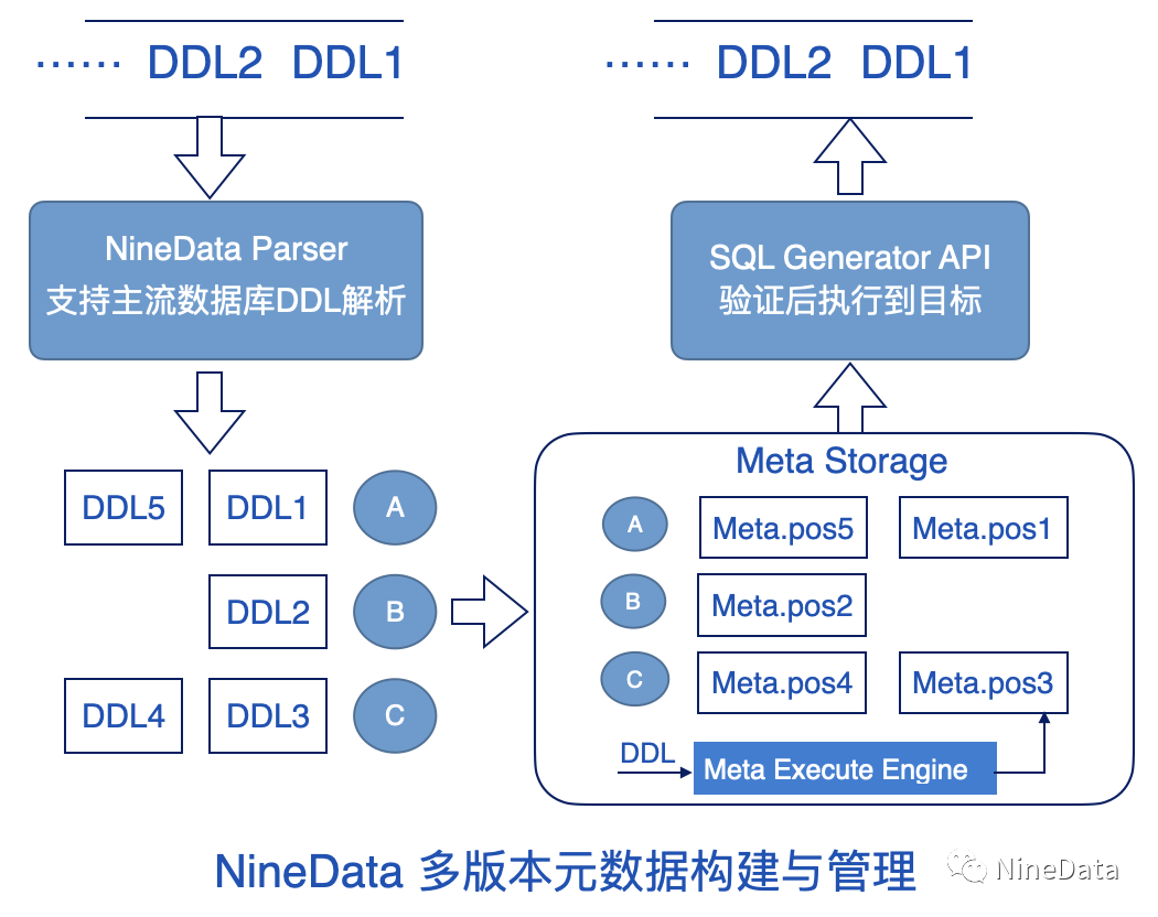 第二、Meta Execute Engine:对于源端的库表结构,以及后续的一系列增量DDL变更,ND-Parser会自动解析提取变更对象,并依次在内存结构中构建对象的Meta,并基于Meta按后续的DDL语句顺序进行增量变更,每一次变更都会在MetaStore中生成meta对象,相当于在内部构造了一个DDL语句执行器。
