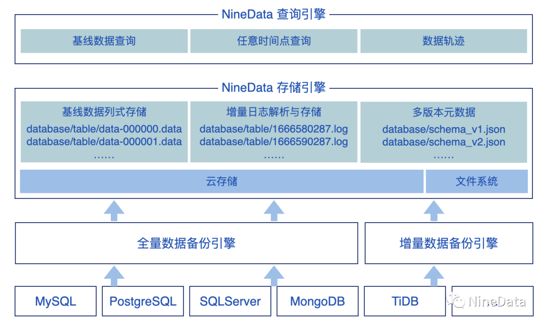最底层是我们的全量备份数据和增量数据的拉取,这里主要做数据读取和必要的解析工作,然后写入到NineData的存储引擎。对于存储引擎层,总体上我们希望有较高的压缩比以降低数据存储成本,写入方面能够同时支持全量和增量写入。