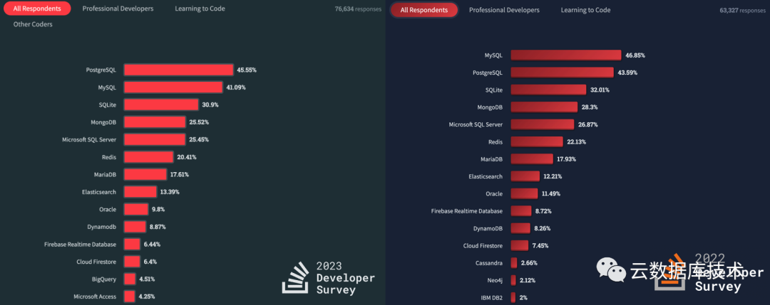 PostgreSQL超越MySQL,成为开发者最受欢迎的数据库:在Stack Overflow发布的2023开发者调研报告中显示,PostgreSQL以45% vs 41%的受欢迎比率战胜MySQL。过去的数年,PostgreSQL一直在经历一场缓慢但持续的增长。参考