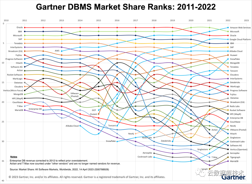 Gartner发布最新数据库市场份额数据(数据来源:参考),几个亮点: