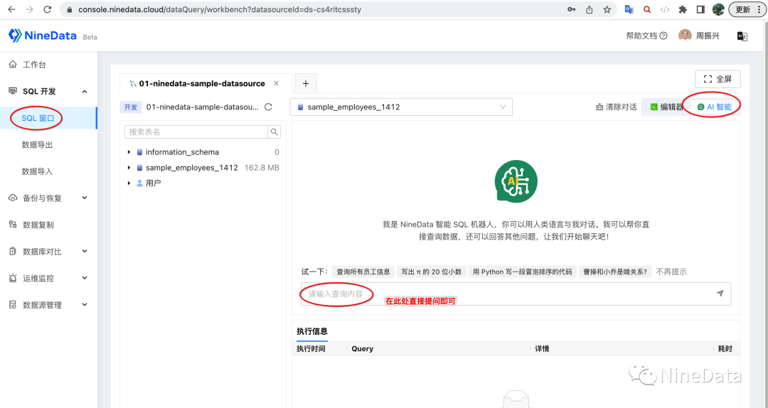 点击右侧导航“SQL 开发->SQL 窗口”,进入一个数据源的 SQL 窗口 -