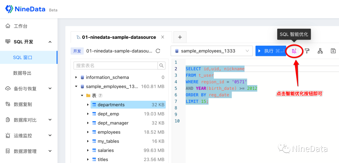 接着只需要在“ SQL 窗口”,输入想要优化的 SQL,并点击“智能优化”,耐心等待就好了。具体的: