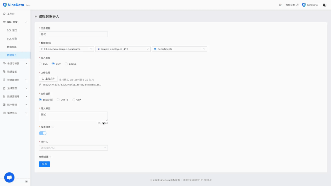 创建数据导入并按表格配置任务(任务名称、数据源/库、导入类型、上传文件、执行人等),保存后跳转至任务详情页面。 -