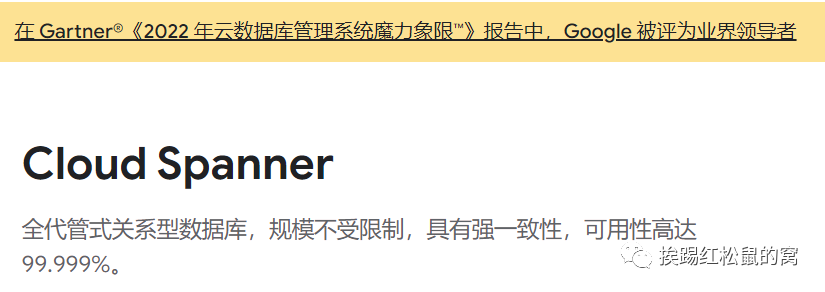 关键信息:苛刻的企业数据库工作负载、卓越性能、扩缩能力、可用性。再看Spanner,非常简洁的一句话: