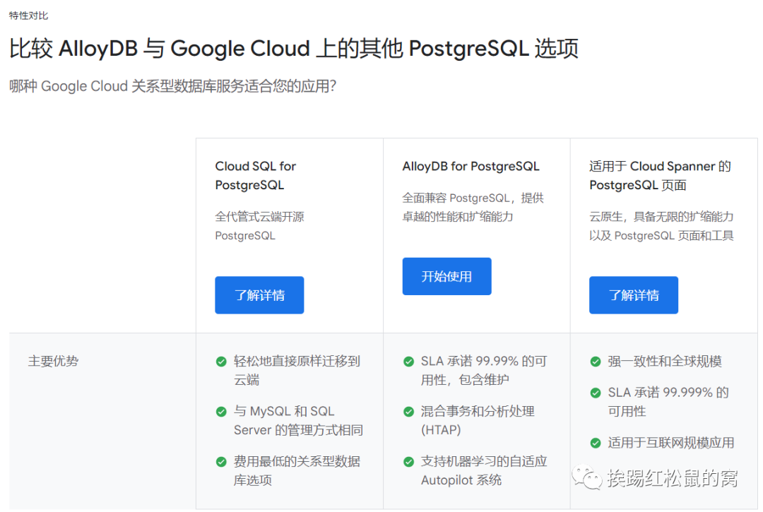 因为AlloyDB与Spanner都是兼容PostgreSQL的数据库,因此Google做了二者与PostgreSQL云服务的横向对比: