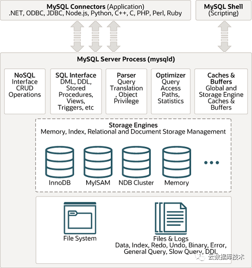 本文将介绍,HEAP、B+TREE、COLUMN-STORE、 LSM-TREE、HASH等存储结构,这些不同的数据存储结构,导致不同数据库的索引、锁、事务等功能特性不同。下图是MySQL架构图,其中存储引擎有InnoDB、MyISAM、NDB Cluster、Memory等。
