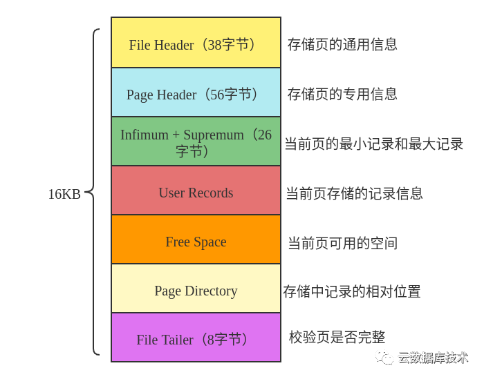 MySQL InnoDB 引擎将数据划分为若干页(page),以页作为磁盘与内存交互的基本单位,页默认的大小为16KB。这样每次磁盘IO至少读取一页数据到内存中或者将内存中一页数据写入磁盘,通过这种方式减少内存与磁盘的交互次数,从而提升性能。page的格式如下图: