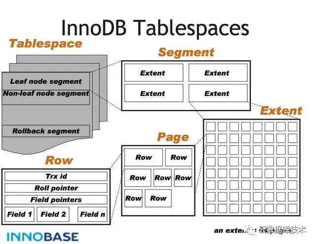 在介绍数据存储结构前,需要先了解数据库逻辑存储架构,常见关系型数据库逻辑架构单元从小到大是:块(block,MySQL称为page 页) > 区(extent) > 段(segment) > 表空间(tablespace)。