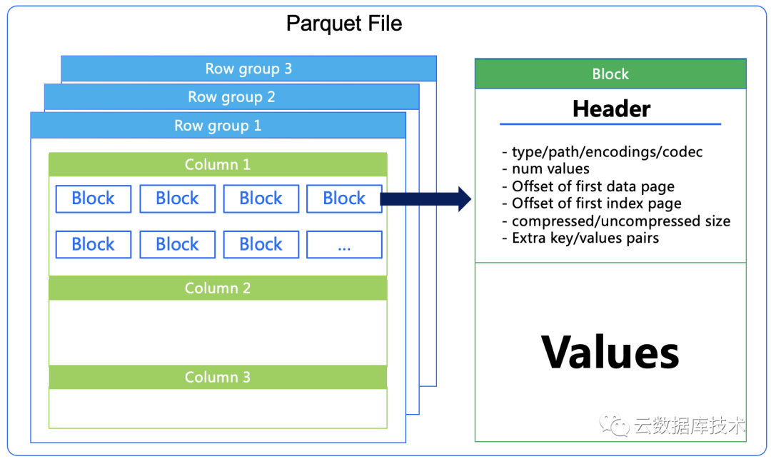 Apache Parquet是面向分析型业务的列式存储格式,一个Parquet文件的内容有Header、Data Block和Footer三部分组成。其中Data Block是具体存放数据的区域,它由多个Row Group(行组)组成,每个Row Group包含了一批数据。在Row Group中,数据按列汇集存放,每列的所有数据组合成一个Column Chunk(列块),一个列块具有相同的数据类型,不同的列块可以使用不同的压缩。因此一个Row Group由多个Column Chunk组成,Column Chunk的个数等于列数。每个Column Chunk中,数据按照Page为最小单元来存储,根据内容分为Data Page和Index Page。如下图。
