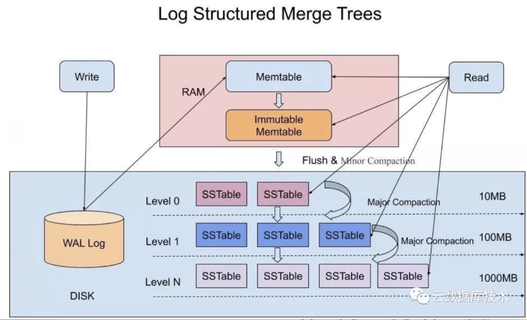 当进行写数据时。先写入 Memtable 和预写日志(Write Ahead Logging, WAL)。因为Memtable 是内存操作,防止掉电需要将记录写入磁盘中的 WAL 保证数据不会丢失。当 MemTable 写满后会被转换为不可修改的 Immutable MemTable,并创建一个新的空 MemTable。后台线程会将 Immutable MemTable 写入到磁盘中形成一个新的 SSTable 文件,并随后销毁 Immutable MemTable。