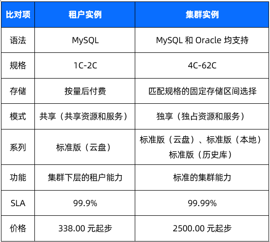 另一种类型是“集群实例”,适合企业级场景,其对比如下图: