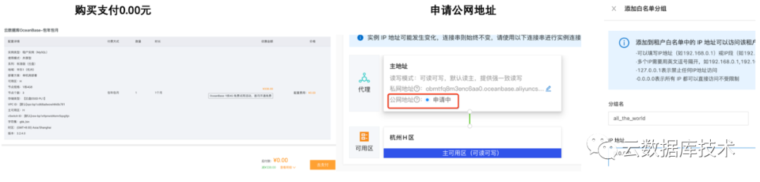 申请->购买->支付->申请公网地址->白名单->连接使用:
