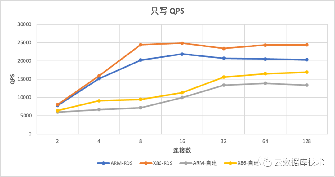 只读场景:「X86-RDS」和「ARM-RDS」差距不大(3%以内),近乎持平;「X86-ECS」性能比「ARM-ECS」平均高20%左右。