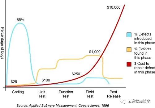 写code就会有bug, 越早发现fix的成本约少。软件工程中这张图是1996的文章。每每在前线客户反馈一个简单的bug, 我脑海里就是这张图和16000美刀