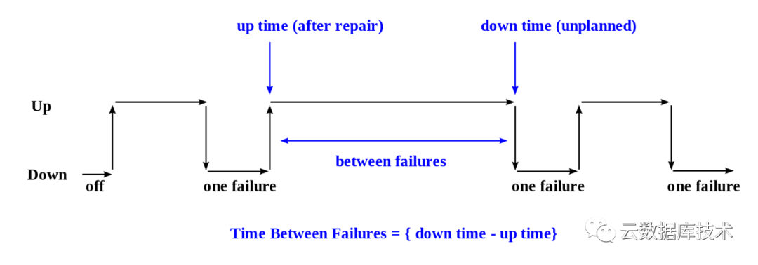 数据库系统无故障可以持续运行的能力。MTBF(Mean Time Between Failure)/MTTF(Mean Time to Faillure),MTTR(Mean Time to Repair/Recover)。这些都是工业界通用的衡量标准。具体计算公式大家自己去Google/wiki。这里盗个图凑数。
