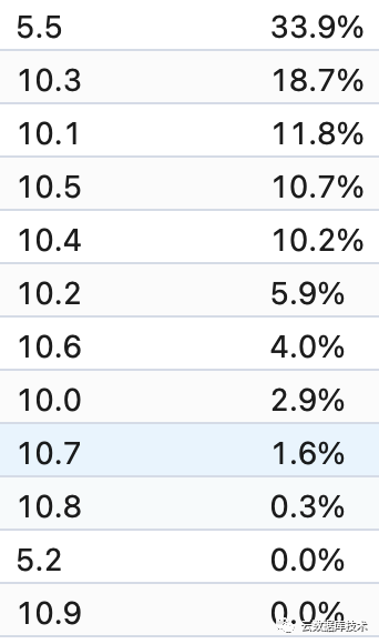 MariaDB是MySQL除了官方外的第一大发行版,当然MariaDB是由MySQL创始人Monty创建,也有着不一样的意义,这里从数据的角度看看MariaDB数量在中国的占比情况。从这份数据(ipv4)中,MariaDB实例数量为12646个,占比为4%。相比之前全球top 10统计中(参考)MariaDB占比14%相比,这里的4%应该是更加真实的反应了MariaDB在中国的境遇的,而且根据实际的经验来看,在生产环境的比率应该是更低的,正如彭祥之前提到的:“China Has Great Potential for MariaDB Server”(参考)。具体的,这部分MariaDB的版本分布如下: