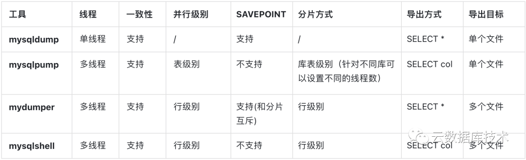 各逻辑备份工具的参数可以看官方文档,对比各工具之后,如表所示: