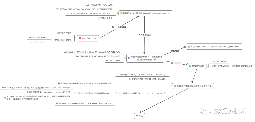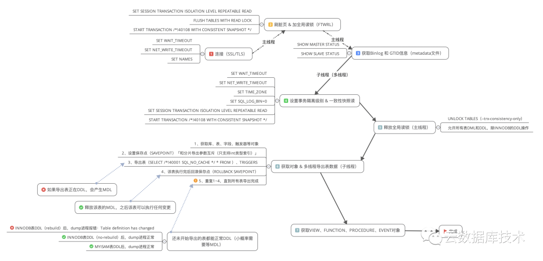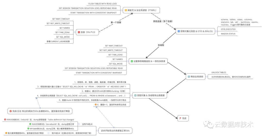 1. 多线程连接数据库,设置当前变量,刷脏页并加一个全局读锁,此刻数据库实例只能SELECT,不能执行任何类型的操作(会影响业务),再设置事务隔离级别和开启一致性快照读并获取GITD 信息,此时所有的支持事务的表(INNODB)数据均来自同一时间点。最后再释放全局读锁,此刻数据库实例可以执行任何操作(正常情况下,加全局读锁和释放锁的时间很短)。