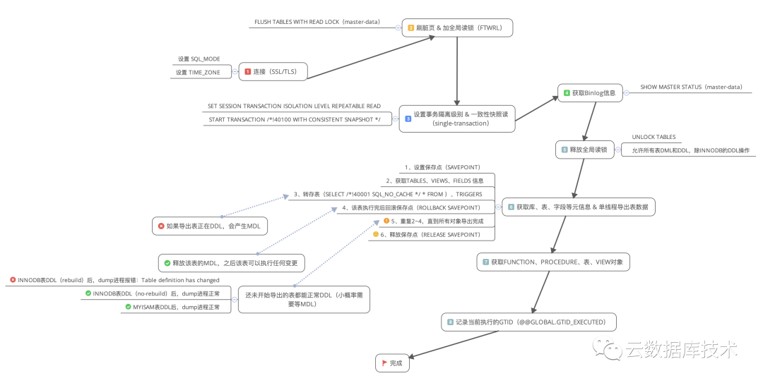 1. 连接数据库,设置当前变量,刷脏页并加一个全局读锁,此刻数据库实例只能SELECT,不能执行任何类型的操作(会影响业务),再获取BINLOG和GITD 信息并设置事务隔离级别和开启一致性快照,此时所有的支持事务的表(INNODB)数据均来自同一时间点。最后再释放全局读锁,此刻数据库实例可以执行任何操作(正常情况,加全局读锁和释放锁的时间很短)。