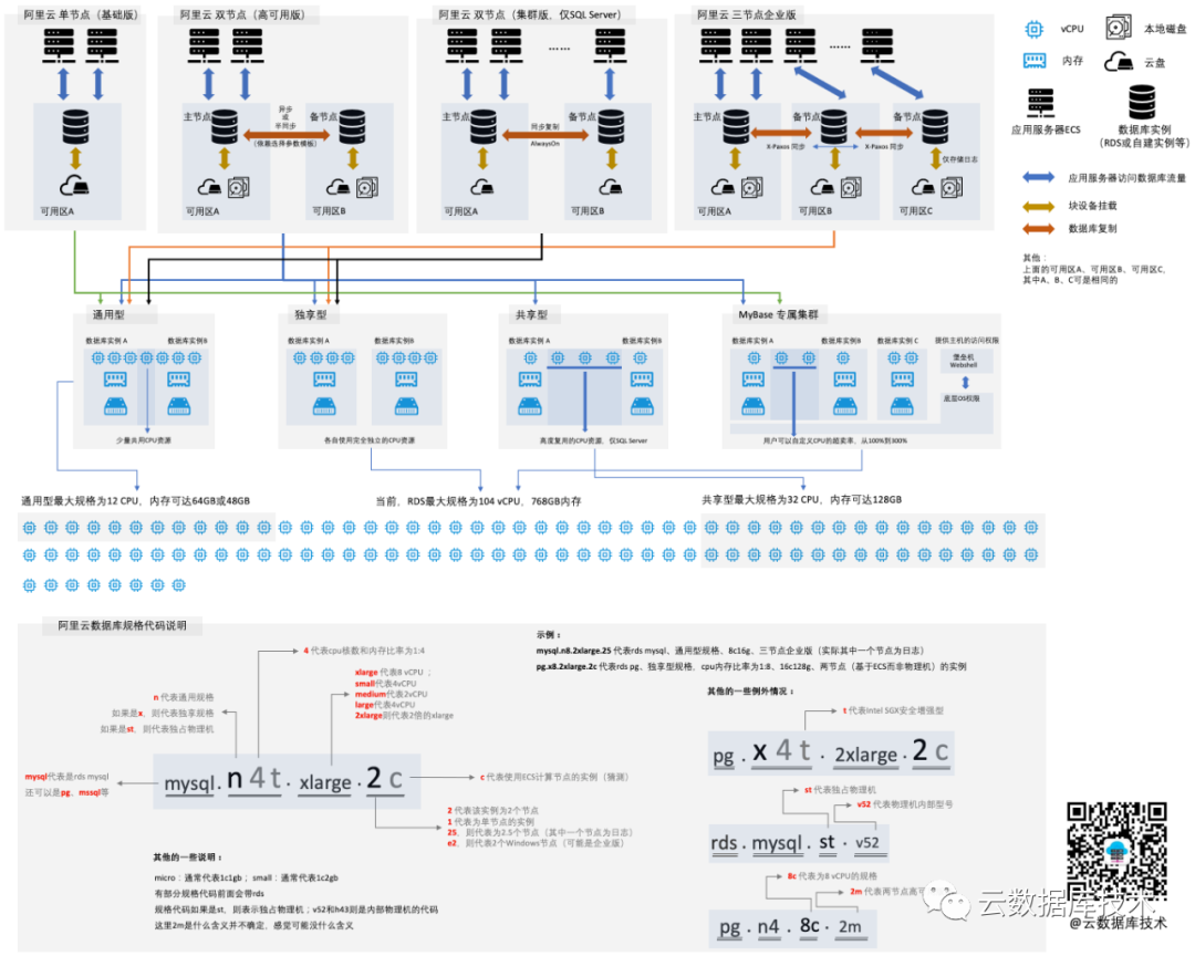 下图从高可用类型、数据可靠性、资源复用率、规格大小、规格代码等角度,较为完整的概况了当前RDS主要的架构与规格: