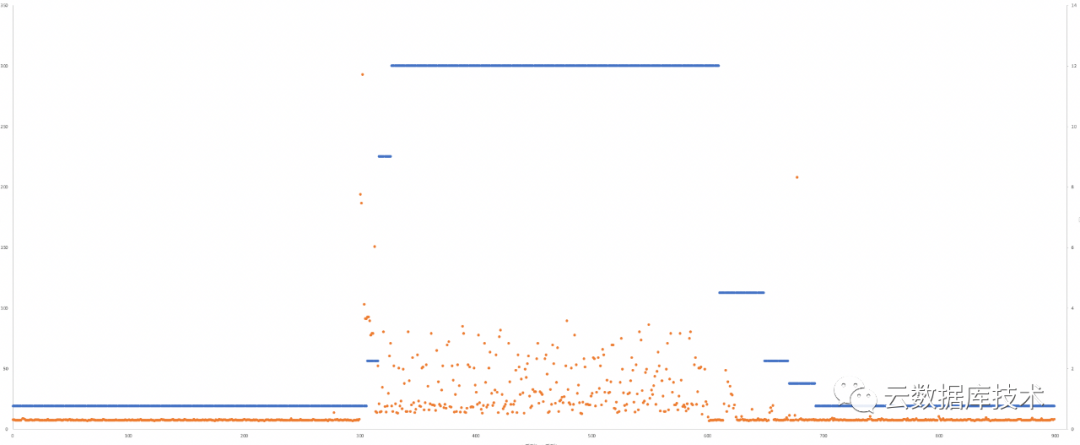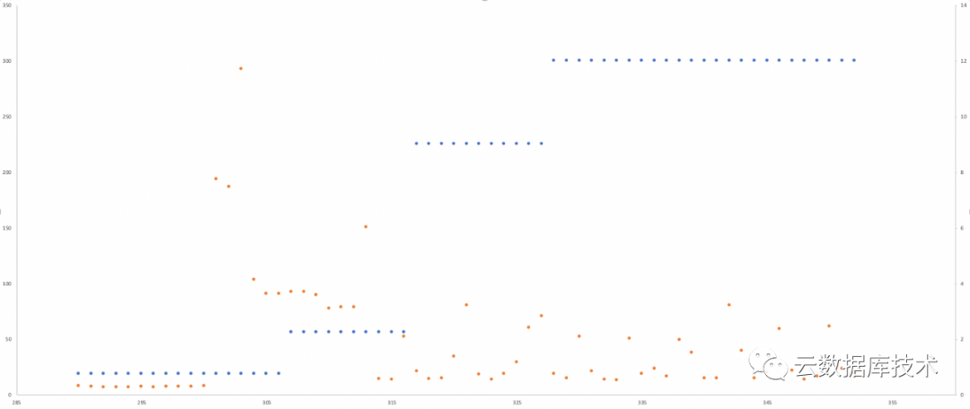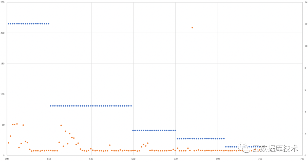 下图黄点代表主进程每秒RT的变化;”蓝点”(连成线)代表秒级别buffer pool的变化。左侧纵坐标为响应时间,单位为毫秒;右边纵坐标为buffer pool大小,单位为GB