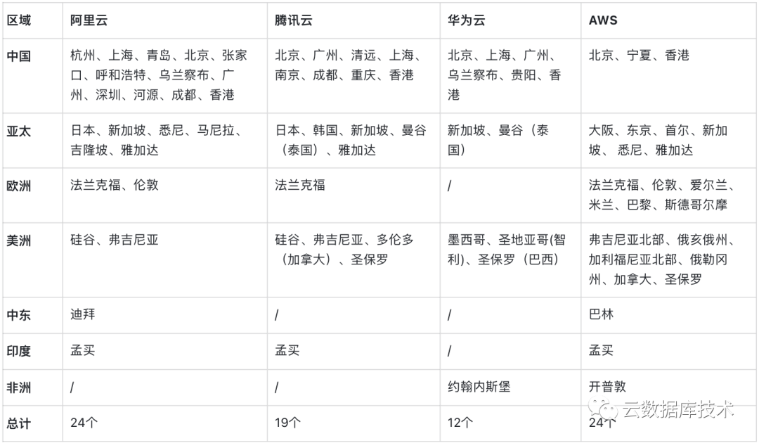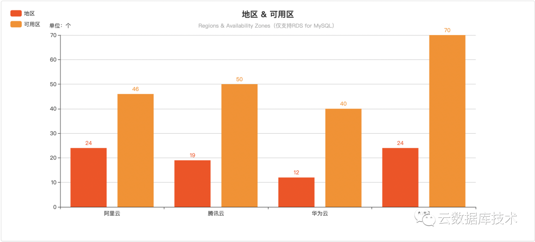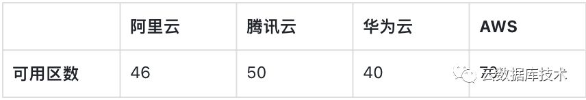 图中所示的是各云厂商在支持RDS MySQL服务的地区和可用区数量,具体看下面表格说明: