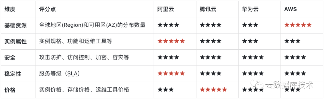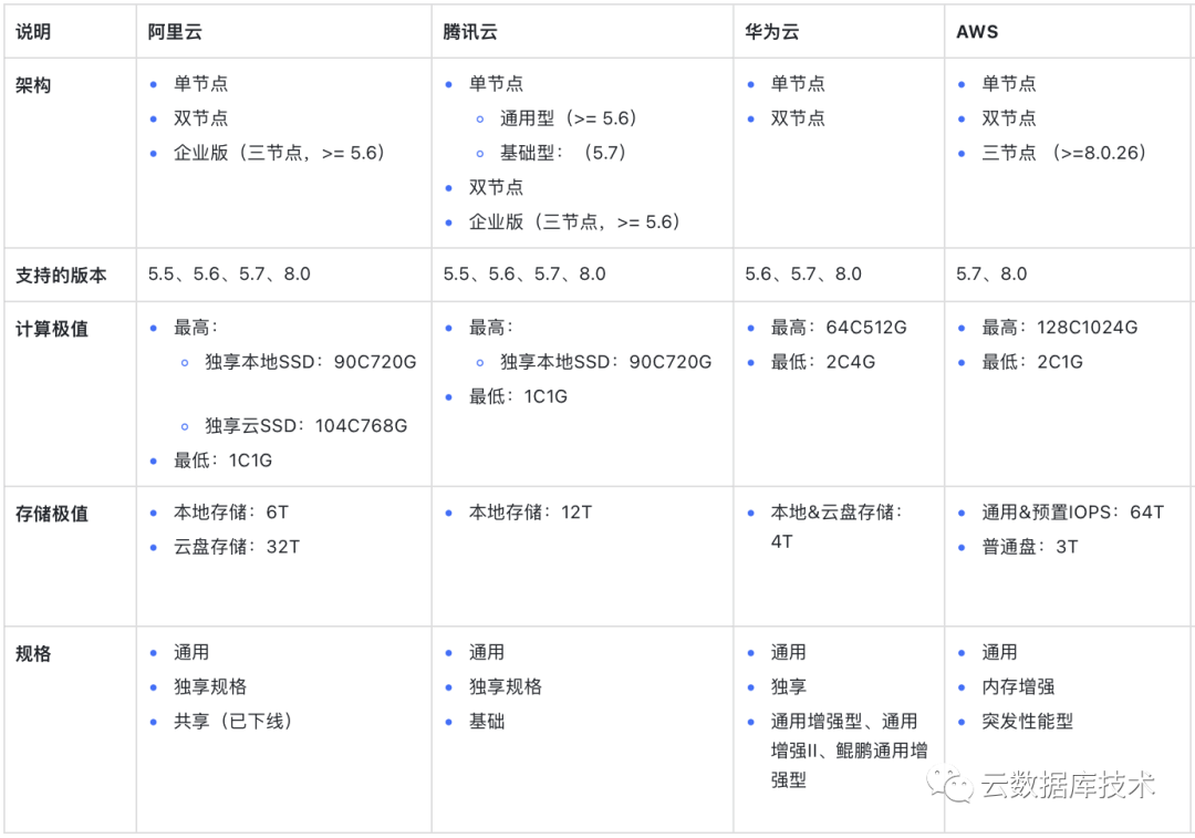 为了让大家更好的了解各云厂商在RDS MySQL数据库功能上的差异,也为给准备上云的同学做个参考,本文将对阿里云、腾讯云、华为云和AWS 的 RDS MySQL数据库进行对比说明。