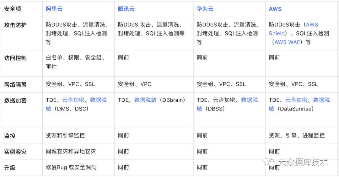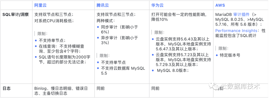 在日志和审计上,各云厂商都支持SQL审计/洞察,腾讯云分同步和异步审计,AWS的审计基于MariaDB的审计插件;阿里云的审计日志对性能影响极低(具体没说明),腾讯云异步影响3%、同步影响6%左右,华为云影响10%左右。