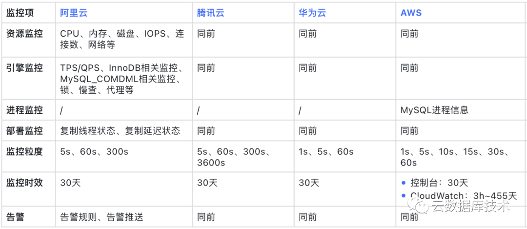 在监控和告警上,各云厂商支持的类似;AWS可以直接监控MySQL的进程信息,如虚拟内存、物理内存、CPU使用; 监控粒度上,华为云和AWS可以支持1s/次的粒度,其他厂商为5s/次。