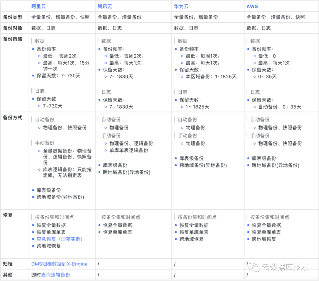 在备份和恢复上,各云厂商都支持了全量、增量的备份和基于时间点的恢复功能(华为云不对逻辑逻辑备份进行支持);阿里云还支持了对数据进行压缩归档和直接查询备份集的功能,以及提供了快速的应急恢复的能力,提供分钟级的RTO或RPO能力,可用于在线数据的即时恢复。