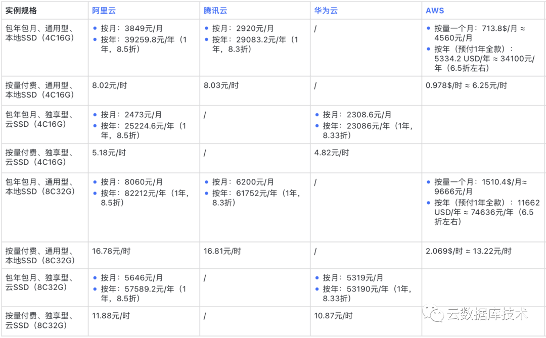 AWS的费用比阿里云(本地盘规格)低10% ~ 15%,比腾讯云(本地盘规格)高17%~21%。