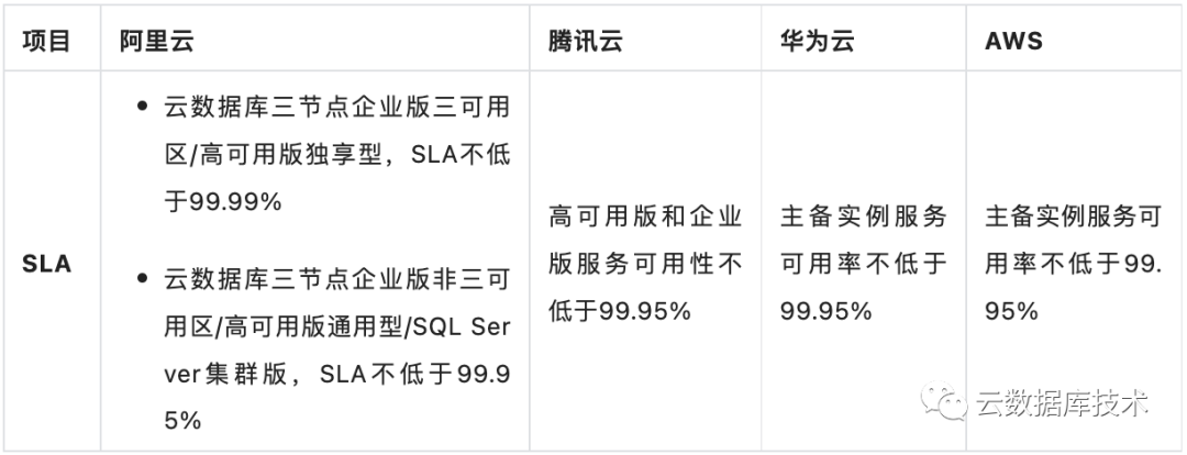 阿里云的独享实例类型在SLA上最高,保证了至少99.99%,其他云厂商都是99.95%。