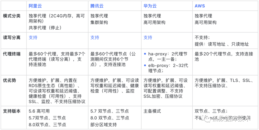 在数据库代理上,国内各云厂商都支持了自动读写分离,只读节点提供读服务;其中阿里云的代理规格是固定的,其他的可以选择不同的规格;AWS的代理在MySQL上没有支持自动读写分离,提供了只读和读写IP。腾讯云目前没有对SSL加密进行支持。