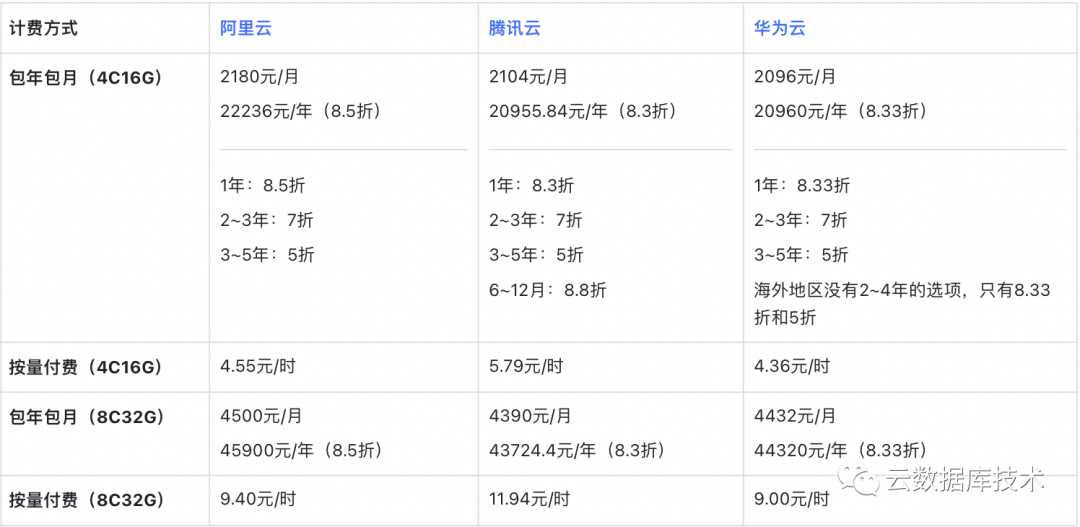 在架构上,阿里云、腾讯云、AWS都支持三节点(1主2备),华为云不支持;其中AWS三节点中的备节点,可以提供读服务,具体可以看 三节点形态,哪些业务场景应该选择 文章的说明。