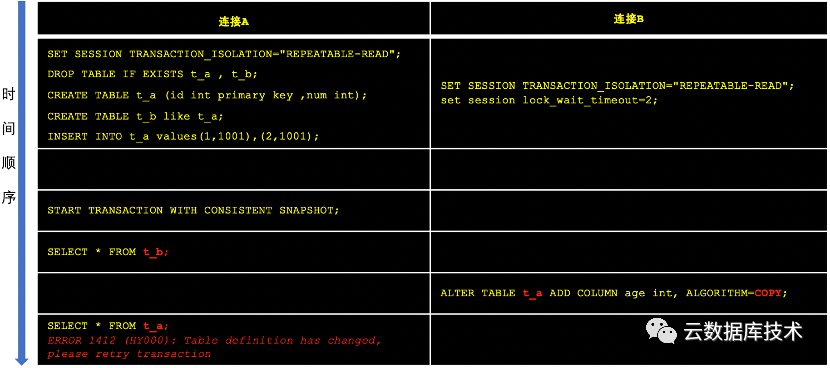 从原理上,简单的来说,当对InnoDB表做DDL操作时,而且该DDL是一个COPY类型的(ALGORITHM为COPY的时候),MySQL会先对该表加上一个全局的锁,不允许任何的写操作,然后新建好一个临时表(新的结构),然后将原表中的数据拷贝到新的临时表中,完成拷贝之后,然后再将原表删除,并将新的临时表重命名为原表。在这个过程中,所有新拷贝的数据都使用新的事务ID,而原表的数据又被删除了。所以,在这个DDL之前开始的事务,都不再能够读取DDL之后的新表的数据,即便这个新表的数据本身并没有被其他任何事务修改。从事务一致性的角度来看,这应该是不可以被接受的,使用了Repeatable Read隔离级别的事务,在某个时刻开始之后,能够读取的数据,应该总是一致的。所以,也比较明确,这就是MySQL的一个已知的限制。