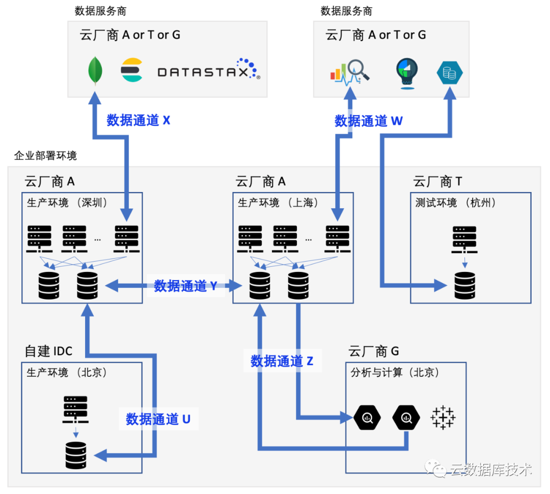 在很多企业中,数据通常会分布在多个云厂商,也可能会有少部分的自建IDC环境。另外,还可能会使用一些SaaS化的数据服务商的产品。典型的数据流通图如下:
