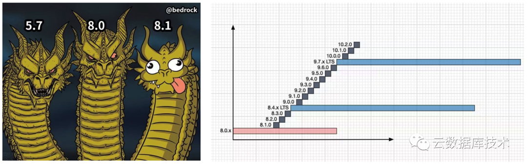 在本周,MySQL团队正式官宣了全新的MySQL版本管理模式(同时支持长期稳定版LTS和创新版本),同时发布第一个创新版本8.1.0,并宣布8.0.34为LTS版本。简单来说,后续8.0系列主要以Bug修复为主,如果对于稳定性要求高的环境则可以使用该系列版本;如果需要更多的新功能的环境(例如测试开发环境),则可以使用8.1.x版本。并且在未来,预计会1一年推出一个LTS版本,按照当前的节奏,下一个LTS版本可能是8.4.x系列:参考。还是忍不住引用一个”网图“: